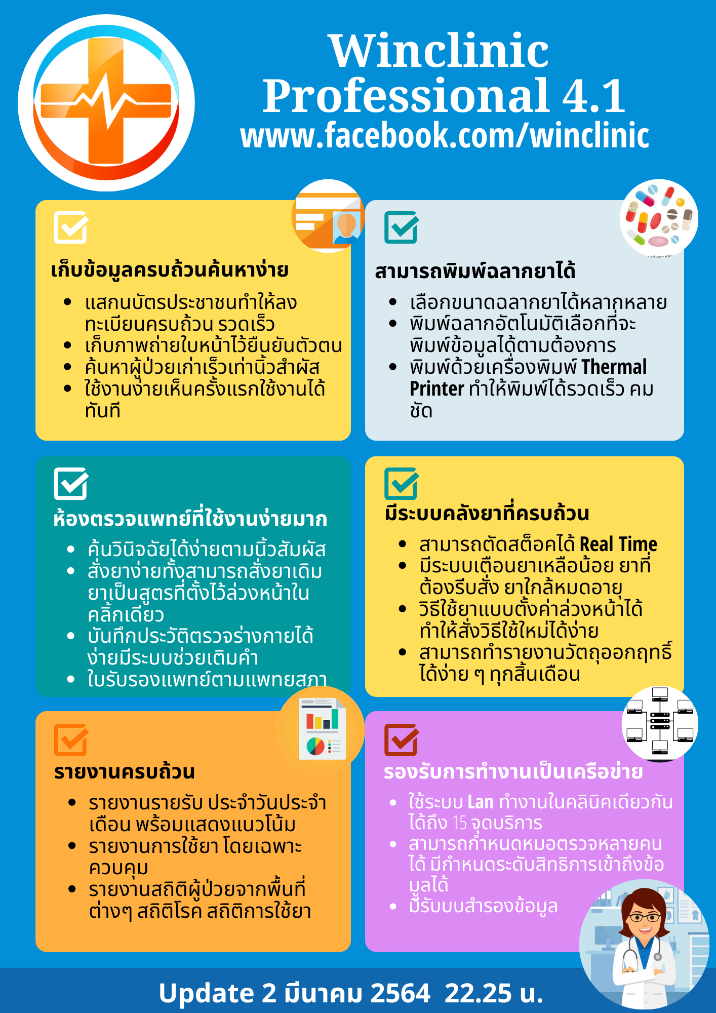 • -เป็นโปรแกรมบริหารงานคลินิก ทำงานบนระบบปฏิบัติการ Windows 7,8 หรือ 10 ทั้ง 32 bit และ 64 bit